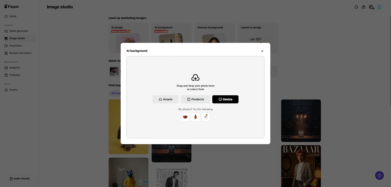 First, sign up for Pippit AI generator background and click “Image Studio” on the left sidebar. Then select “AI Background” under “Level up marketing images.” You can drag and drop your product pictures or click “Device” to import them from your PC. If you donāt have your own photos, try the sample photos provided.