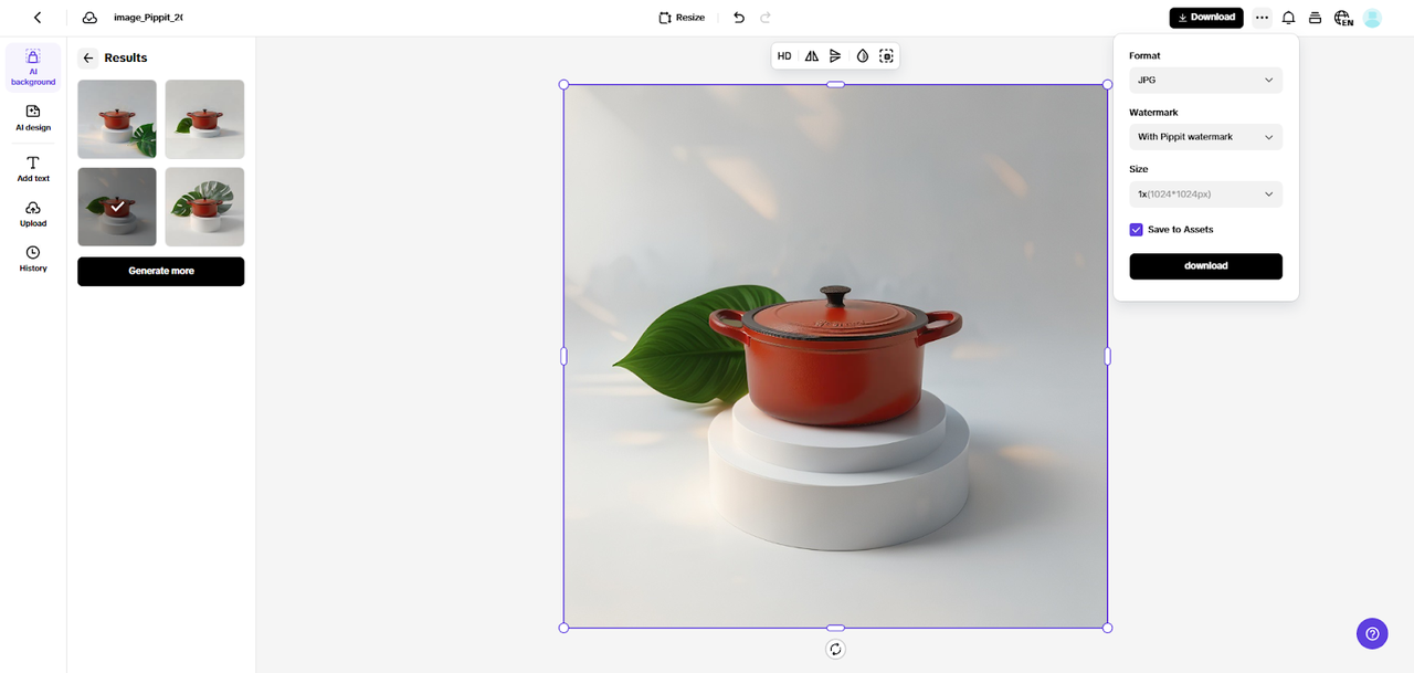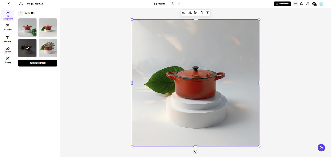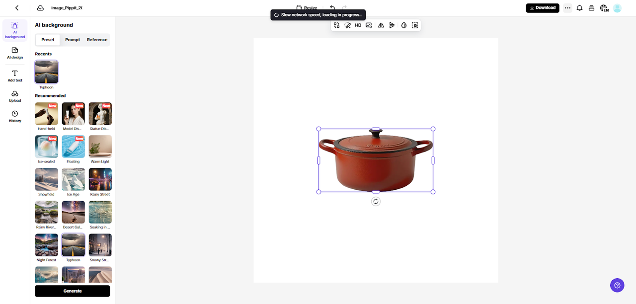 The AI Background tool will instantly erase the backdrop, removing any clutter. You can then go to “Preset” to pick a background, click “Reference” to upload your own, or choose “Prompt” to generate one using AI. After selecting your background, hit the “Generate” tab. The AI will create 4 variations of the background, and you can pick the one you like best. You can also use “AI design” to enhance your image further or “Add Text” to overlay captions.