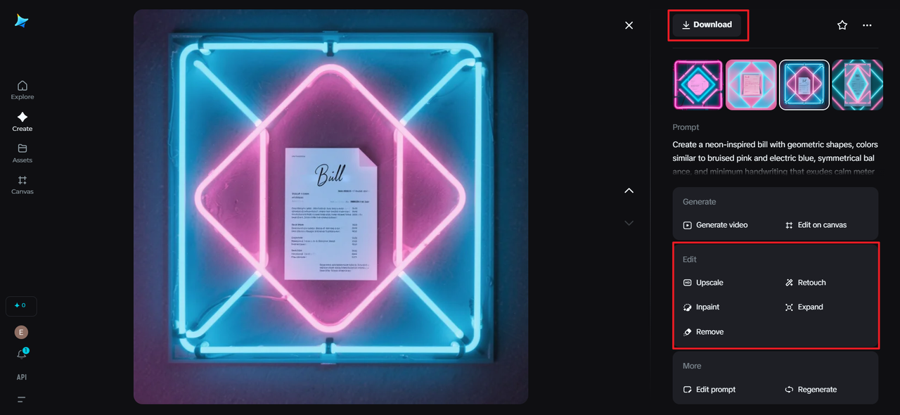 After generation, use Dreamina’s customization tools to fine-tune the composition. Try inpaint to correct small visual “spelling errors,” expand to add new narrative space, remove to simplify crowded areas, and retouch to polish balance or tone. Once everything aligns and your design feels fluent, click the “Download” icon to save your final visual sentence — ready to be read by the world.